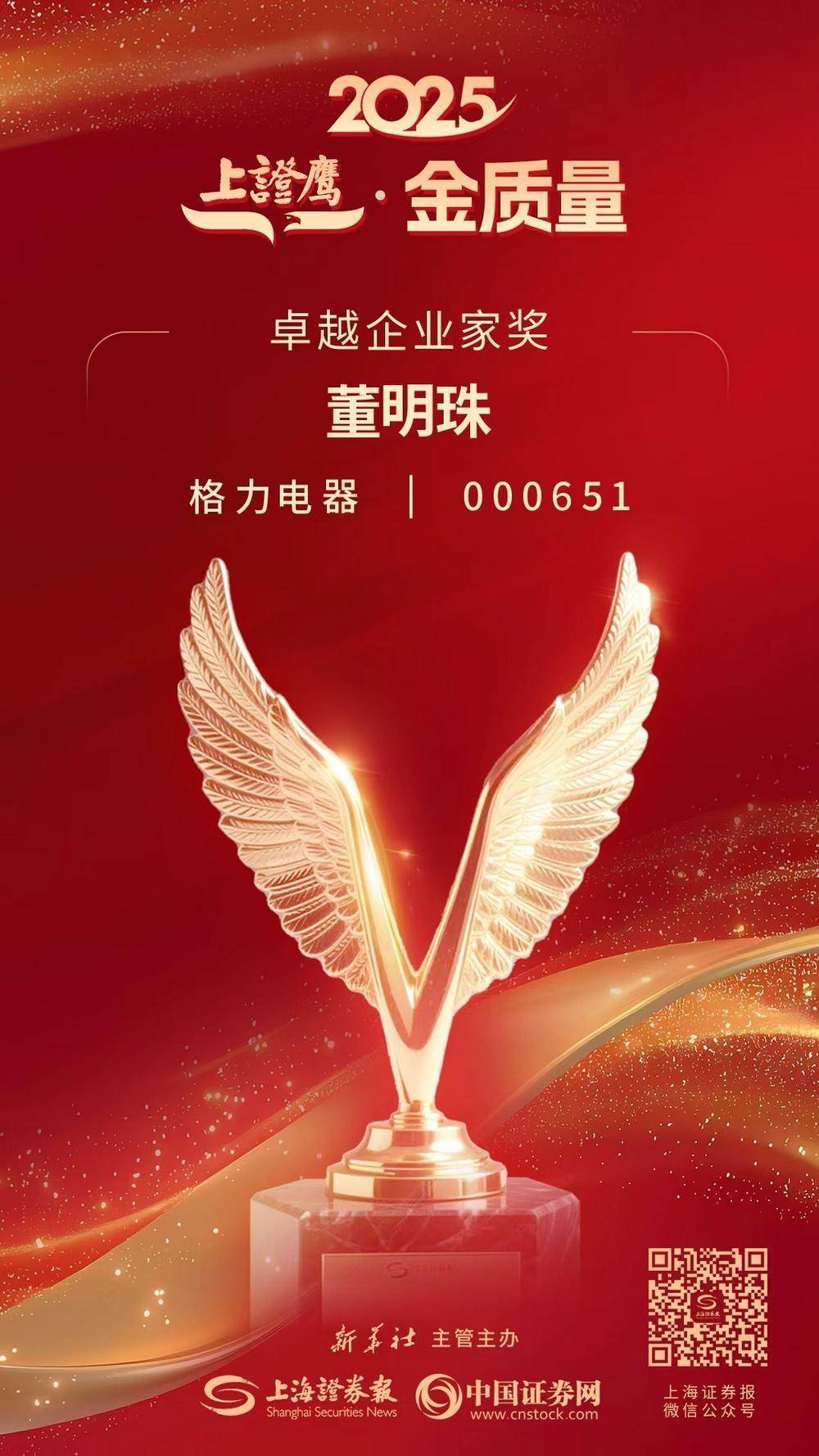 近日,由新华社主管、上海证券报与中国证券网联合承办的2025“上证鹰·金质量”评选结果揭晓,格力电器董事长董明珠获颁“卓越企业家奖”。